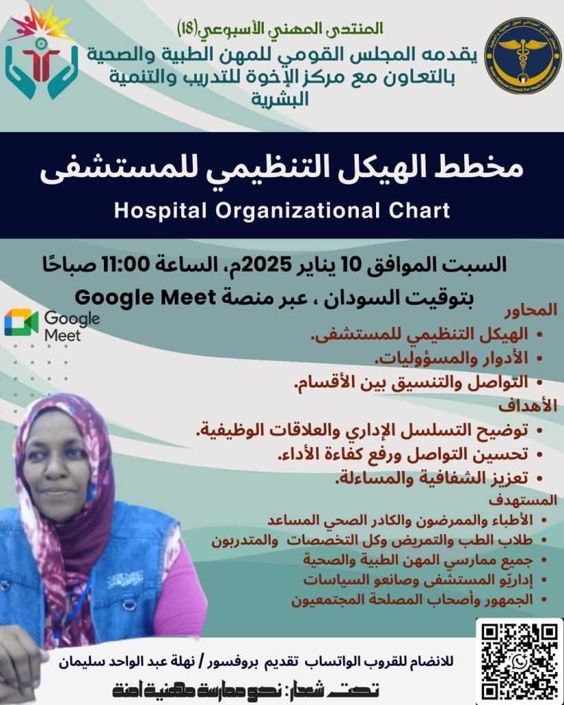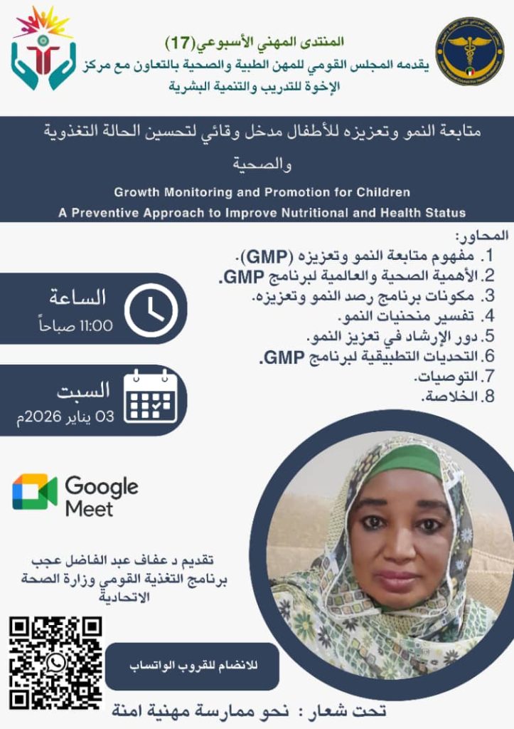 📢 دعوة لحضور المنتدى المهني الأسبوعي 🎓 يدعوكم المجلس القومي السوداني للمهن الطبية والصحية بالتعاون مع مركز الإخوة للتدريب والتنمية